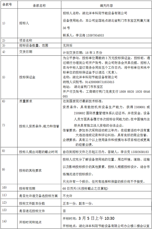 本招標項目數控機床由招標人湖北洋豐科陽節能設備有限公司自行組織招標,設備地點為本公司坐落地點湖北省荊門市東寶區荊襄大道56號。現邀請在中國境內注冊并具有獨立法人資格的合法企業前來投標。