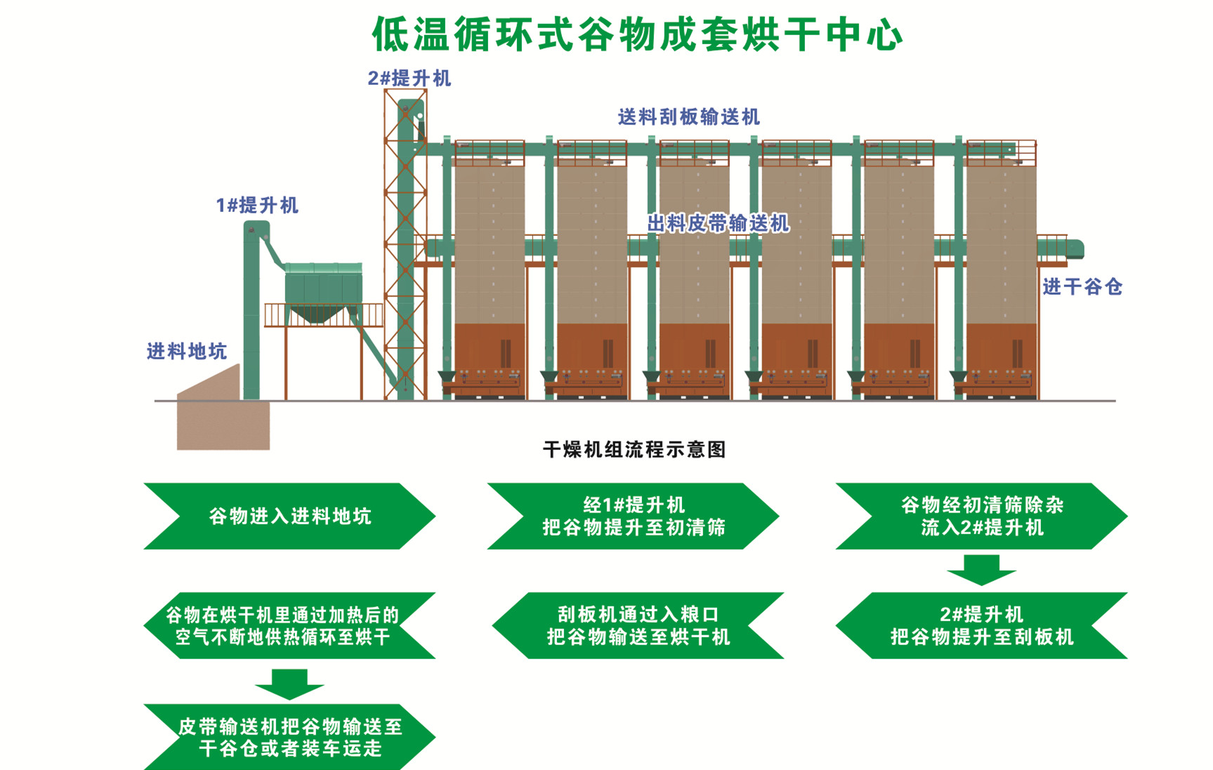 根據雙方簽訂的合作協議,我公司將為鐘祥市德爽糧食種植專業合作社設計安裝100T的谷物干燥設備,該工程由6臺16T的混流式低溫循環干燥機組合而成。(如下圖所示)